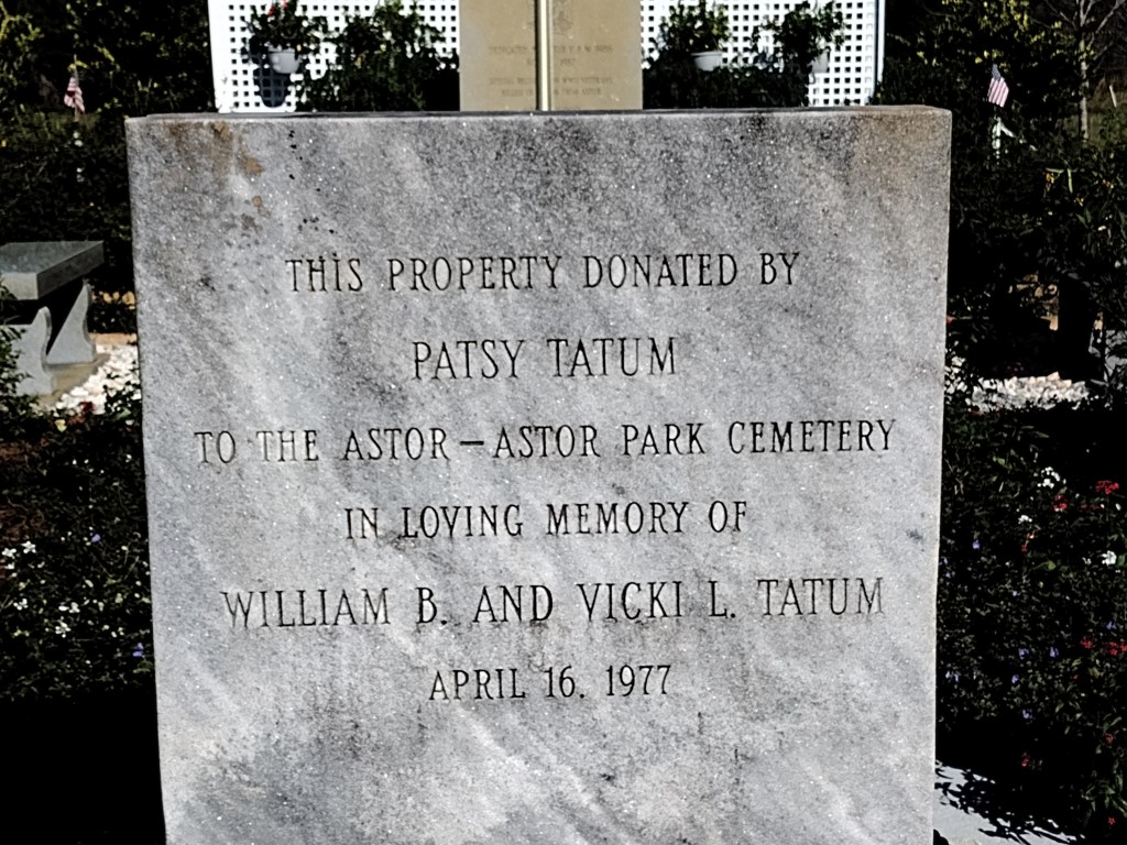 William Astor, grandson of the self-made millionaire John Jacob Astor, purchased 12,906 acres of land along the Saint Johns River in March 1874. William Astor, along with his business partners, constructed the first town and called it Manhattan. The town was later renamed after its founder as Astor. The town had a church (the original building of the First Baptist Church of Astor), a school, and a general store. Some of the land on which the cemetery resides was named Astor Park. When William Astor died in 1894, the land passed down to his son, John Jacob Astor IV, who died 18 years later with the sinking of the Titanic in April 1912.